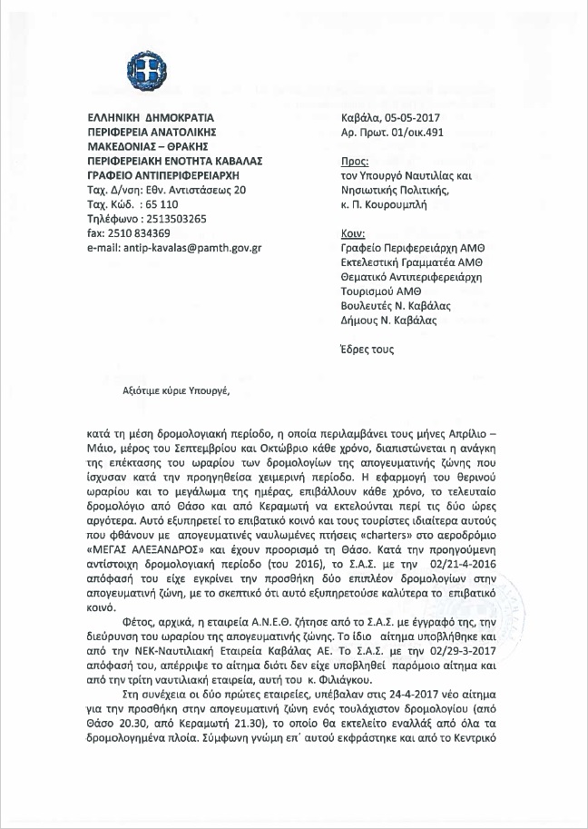 Ο λόγος για το αίτημα που κατέθεσαν από κοινού ΑΝΕΘ και ΝΕΚ για την προσθήκη τουλάχιστον ενός βραδινού δρομολογίου από Κεραμωτή προς Λιμένα Θάσου και αντίστροφα -ενός δρομολογίου βασικός σκοπός του οποίου είναι η εξυπηρέτηση των παραθεριστών που καταφτάνουν στο αεροδρόμιο της Χρυσούπολης “Μέγας Αλέξανδρος” ή αναχωρούν από αυτό.
