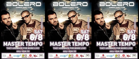 Οι Master Tempo επιστρέφουν στο Bolero Summer Dance Club το Σάββατο 6 Αυγούστου, με όλες τις καινούριες τους επιτυχίες. Ο Petros και ο Zanis υπόσχονται ένα απίθανο live όπως και πέρυσι.