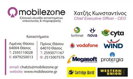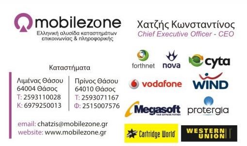 Η Mobilezone είναι μία κατασταλαγμένη και φιλόδοξη εταιρία από το 2006 στον χώρο της πληροφορικής και της τηλεπικοινωνίας. Είναι παρών με 2 καταστήματα στον Λιμένα και τον Πρίνο τα οποία δραστηριοποιούντε στην Θάσο.