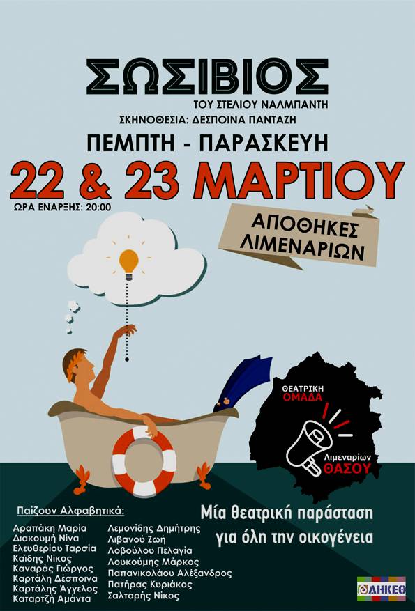 Η Δημοτική Θεατρική Σκηνή Λιμεναρίων μετά την πετυχημένη παρουσίαση στην Πάφο της Κύπρου του έργου “ο Σωσίβιος” του Στέλιου Ναλμπάντη σε σκηνοθεσία Δέσποινας Πανταζής, θα δώσει 2 παραστάσεις στις 22 και 23 Μαρτίου στις Αποθήκες Λιμεναρίων.